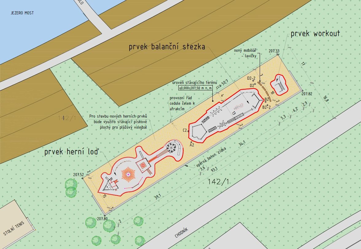 This playground looks like a shipwreck on a sandy beach. It features low rope obstacles and various play elements that resemble parts of a ship – a crow's nest, helm, ship’s phone and more. The centrepiece is a lighthouse with a viewing platform and a slide, connected to the ship by a hanging bridge. A sailor-themed balance trail and workout elements complete the site.