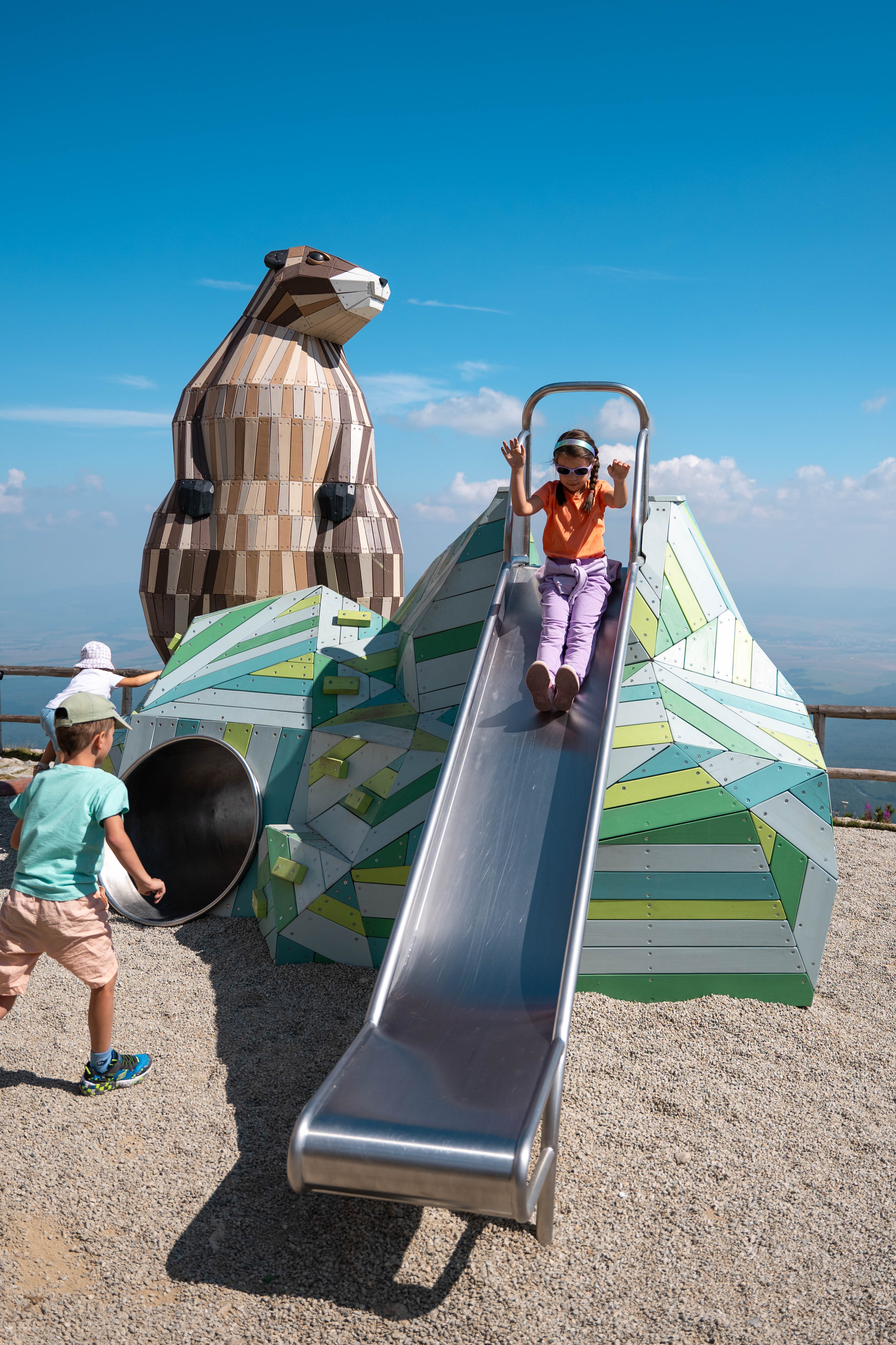 Skalnaté pleso je turistickou křižovatkou ve Vysokých Tatrách. Díky lanovce je snadno dostupné i pro rodiny s malými dětmi.Právě pro ně zde bylo vybudováno dětské hřiště, které však po letech provozu potřebovalo oživit. Navrhli jsme zde ne jednu herní sochu, ale hned tři: dva sviště a jednu medvědí rodinku.